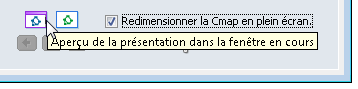 Le Concepteur de présentation vous permet d'afficher les diapositives dans la fenêtre en cours ou d'utiliser la totalité de l'écran. Pour afficher un aperçu de la présentation dans la fenêtre en cours, cliquez sur le bouton Aperçu de la présentation dans la fenêtre en cours, puis utilisez les boutons de navigation qui apparaissent. La case à cocher Redimensionner la Cmap en plein écran peut être utilisée avec le bouton Afficher la présentation en mode plein écran.